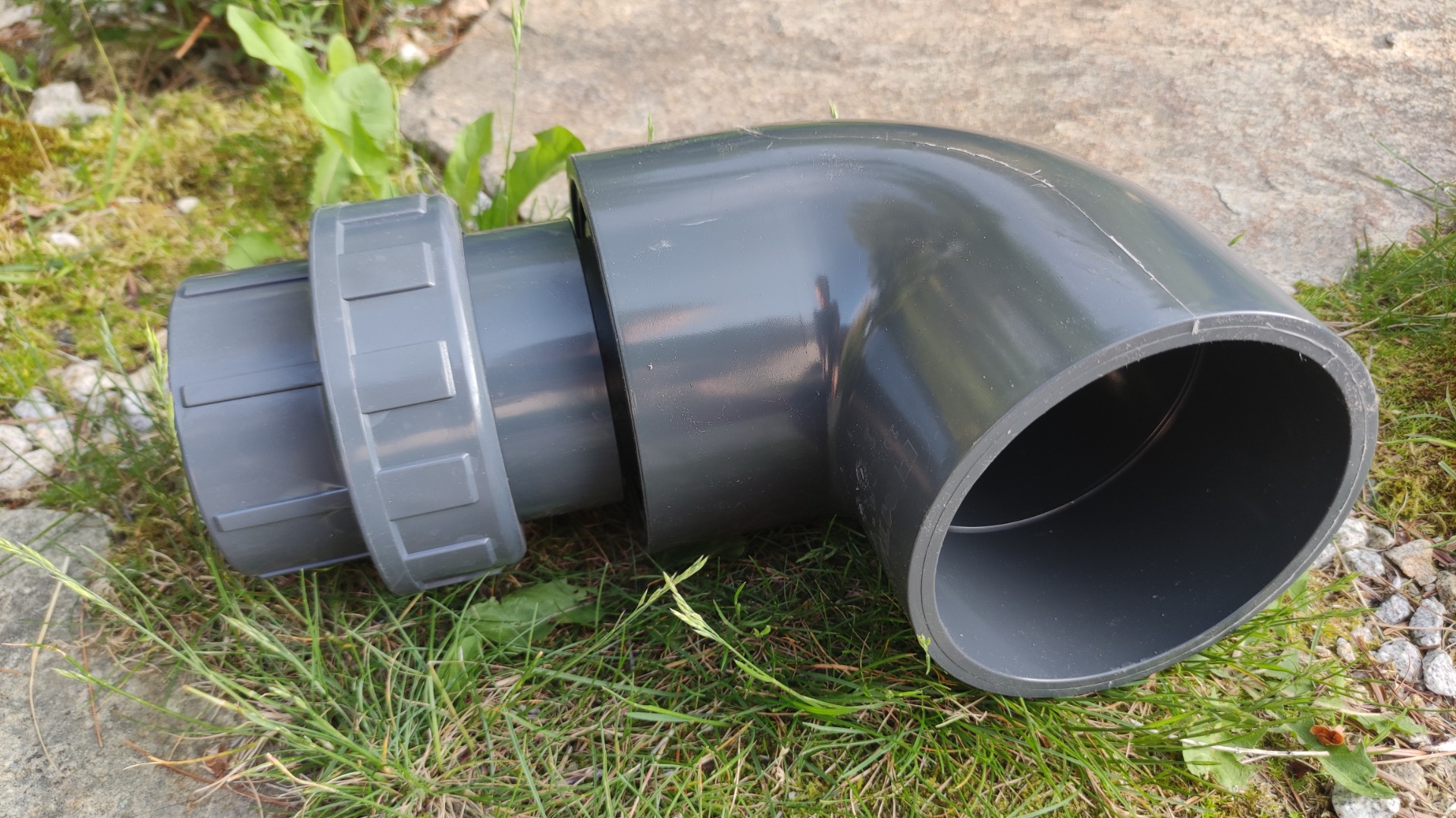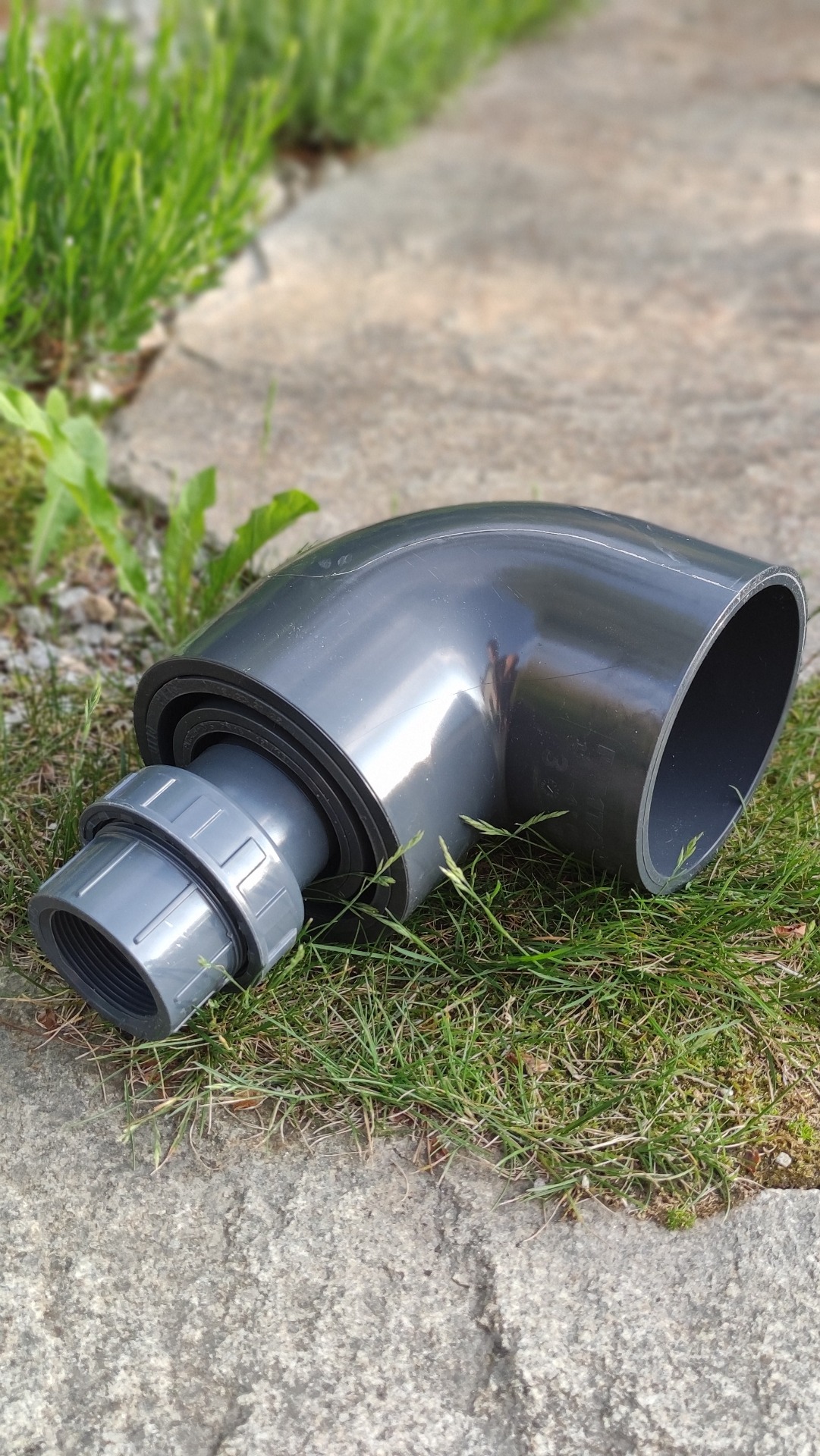 Sestaveno na volno kvůli možnosti sestavení dle potřeb zákazníka - např. použití delší spojovací trubky mezi kolenem a šroubením. Díly se lepí pomocí sady na lepení (čistič + lepidlo).